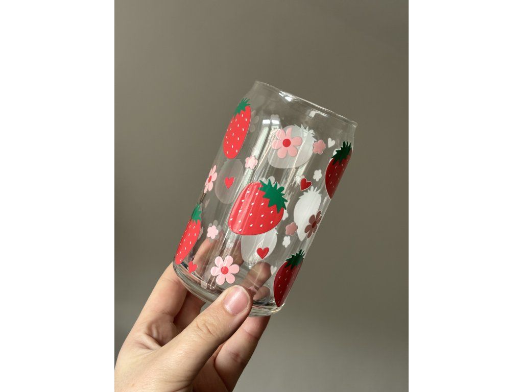 Krásná sklenička ve tvaru plechovky s ručně lepeným polepem.